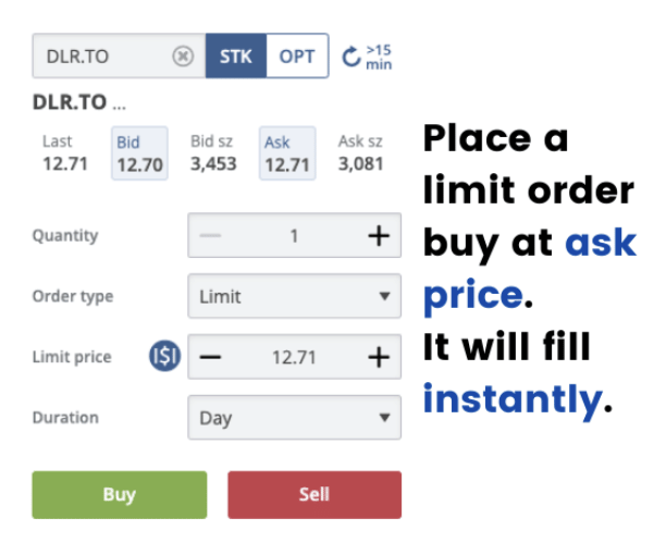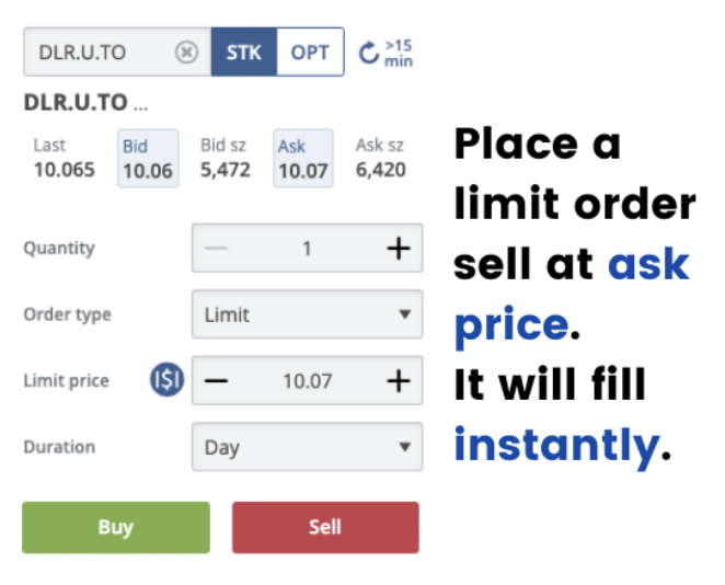 You can also sell your DLR.U shares with a limit order at the bid price if you want it to fill instantly.